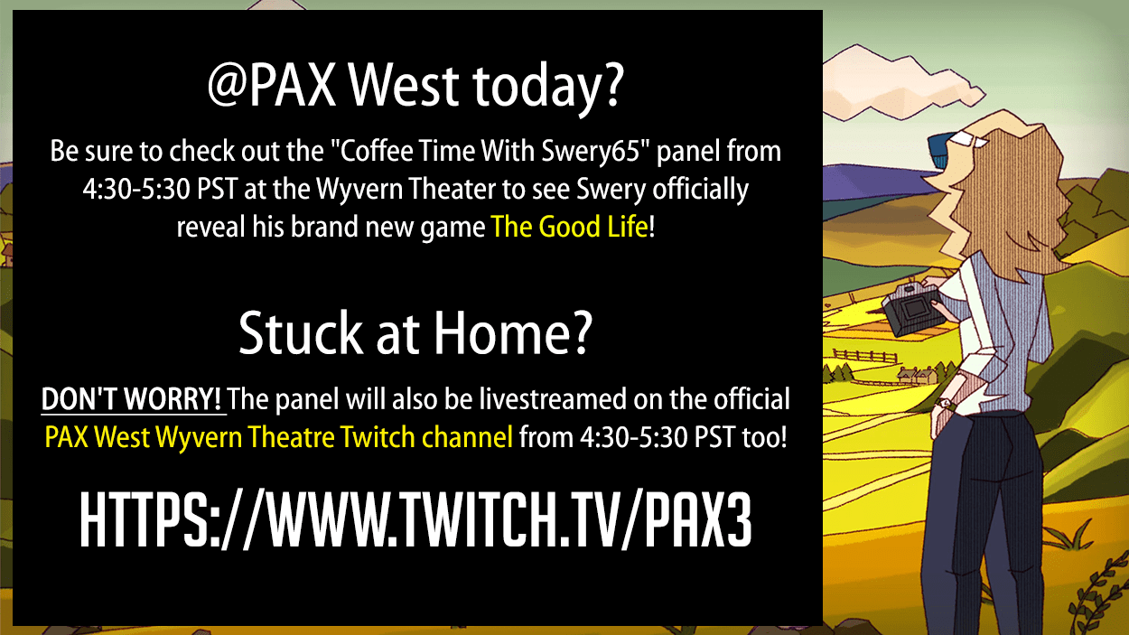 Hey guys if any of you are at PAX West don’t forget! Swery’s “Coffee Time With Swery65” panel will be from 4:30-5:30 PST over at the Wyvern Theater today where he plans to officially reveal his new game The Good Life!